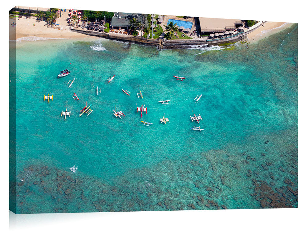 Hekcopter view of outriggers off the shore of Outrigger Hawaii, in Waikiki.
