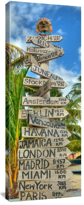 Sign Post Rolled Canvas Prints This is Caye Caulker Belize Sign post with many signs listing distance in kilometers to major cities around the world. More and more travelers are finding their way to Caye Caulker and Belize thru Cancun and Chetumal, Mexico. Inexpensive flights to Cancun are readily available and the bus line ADO services the run from Cancun to Chetumal. Two of the three water taxi companies, San Pedro Express and Water Jets Express, have daily run from Chetumal to San Pedro on Ambergris Caye in Belize, where you will clear Belize Customs and then a 30 minute boat ride to Caye Caulker, usually arriving around 6,30 pm at night. Depending on when your flight into Cancun arrives, you may have to make the journey from Cancun to Chetumal the following day. The beaches here on the caye tend to be soft and weedy due to the fact the reef protects us from the Caribbean surf and does not allow it to scour the sand free of growth. This allows the island to survive as wave action would eventually wear the caye completely away. It also contributes to a vibrant ecosystem which encourages sea life to flourish. The island name is spelled Cay Corker. Known historically for its plentiful supply of exposed fresh water at La Aguada, one theory holds that this island was a favorite stop for sailors to replenish and cork water bottles. With few inhabitants, food could be grown with sustainable methods of agriculture. The coconut and the fishing industry became important economic staples of the island. Even today a few of the older women continue to process coconut oil for their own use and to sell, although generally the coconuts themselves are harvested and shipped to the mainland.